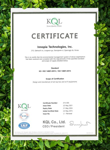 - INNOPIA have the International Standard Certification for Environmental Management System (ISO14001), which is a globally recognized standard comprising of well-defined plans, practices, reviews, and continuous improvement processes aimed at minimizing environmental impacts throughout the lifecycle of our operations, including purchasing, development, manufacturing, usage, and disposal.